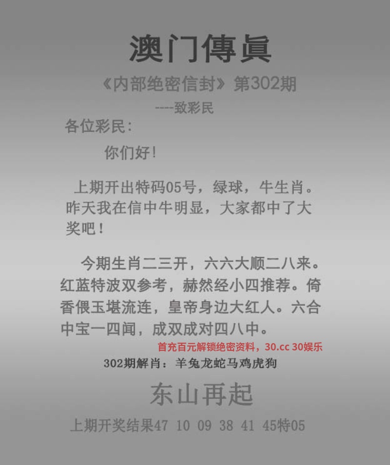 传真302期 今期生肖二三开,六六大顺二八来。 红蓝特波双参考,赫然经小四推荐。 倚香偎玉堪流连,皇帝身边大红人。 六合中宝一四闻,成双成对四八中。 东山再起 解:今期生肖二三开指23羊,六六大顺二八来指06鼠28虎,红蓝特波双参考指红波蓝波,成双成对四八中指双肖龙马猴虎鼠狗。 拐特生肖:羊龙马猴兔鼠狗鸡猪 主特:11.23.14.26.24.36.22.34.15.27.18.30 |
