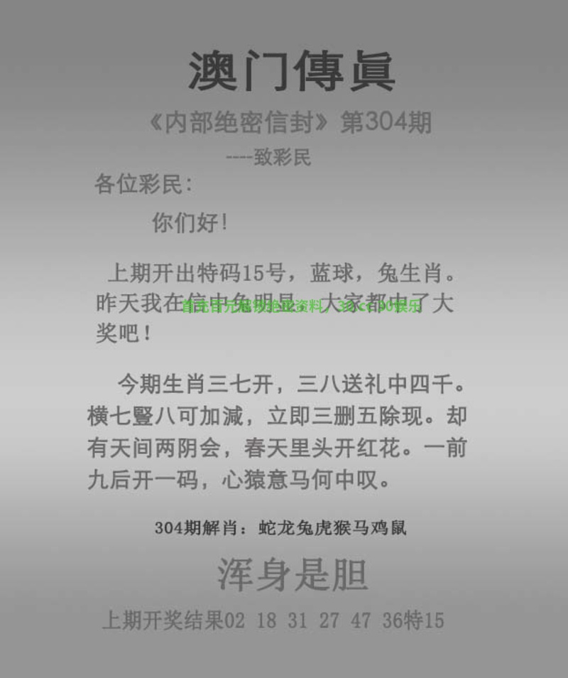 传真304期 今期生肖三七开,三八送礼中四千。 横七豎八可加減,立即三删五除现。 却有天间两阴会,春天里头开红花。 一前九后开一码,心猿意马何中叹。 浑身是胆 解:今期生肖三七开,解大数特码25-49,却有天间两阴会,解阴肖鼠龙蛇马狗猪。 拐特生肖:兔鼠虎马牛猪羊蛇狗 |